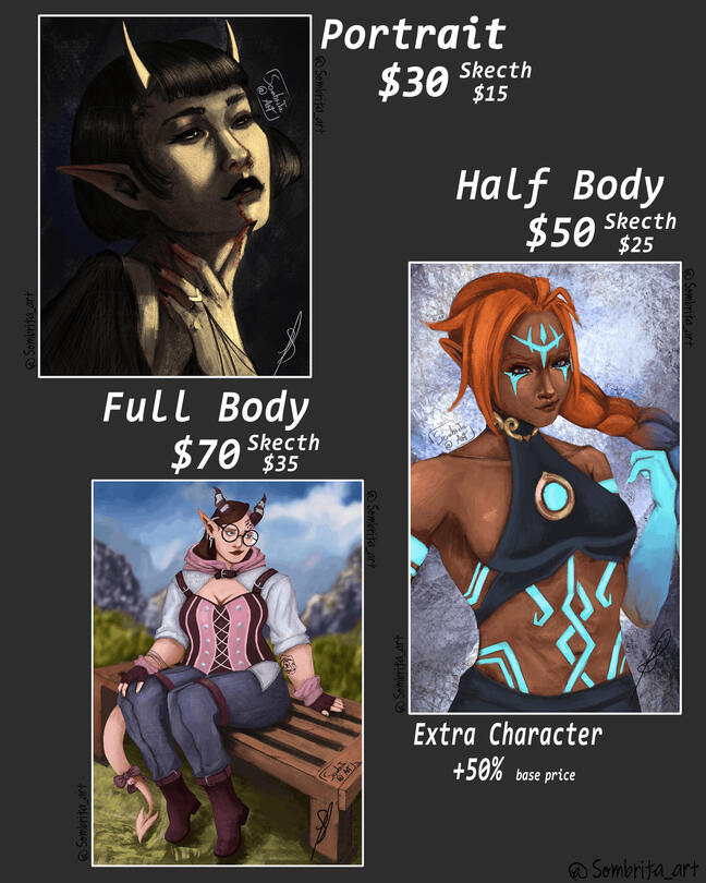 ❥ Payment only through paypal or Vgen!❥Don't send me any payment before I have agreed to accept your commission!❥ Commercial use increases pricing to 100% up to 500% depending on the work, this can be discuss under a contract!❥ Work with full NDA will have a minimum plus $50 fee!❥ All the prices are just a base, they might change do to complexity/extra characters/background!❥Extra characters cost +%50 of the base price!❥ Pets or creatures cost +%30 of the base price!❥ Commissions can be paid 100% upfront or 50% before sketch 50% after sketch!❥If it's your first time commissioning me and for safety you want to pay only after the sketch, please contact me!❥ If you paid 100% upfront you can only refund 50% of the original price if I already finished the sketch!❥ After approval of the sketch, there will be no refund!❥If you already paid and I'm unable to start or continue your commission you will receive a full refund!❥Tips are appreciated but not necessary!